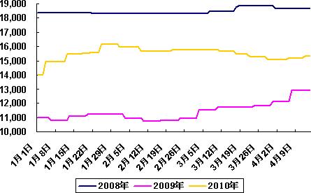 下面這張圖為2008-2010年1-4月EVA市場價格的走勢(以華南地區5110J市場價格為例)。