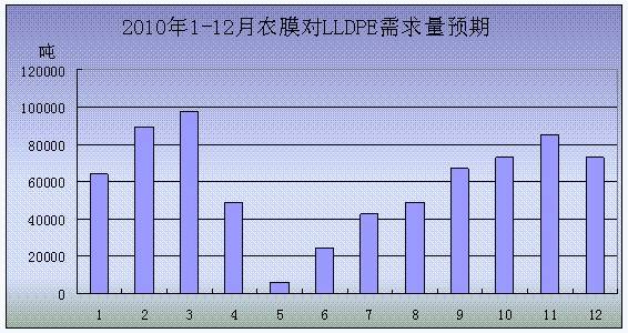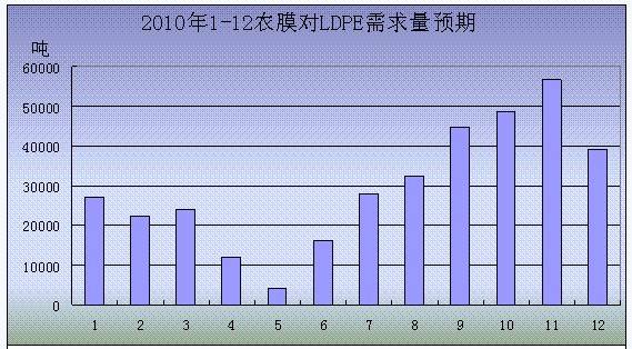由以上圖表可以看出,8-12月份農膜對LDPE和LLDPE的需求量逐步上升,五月處于最低點,六月份小幅回升,一直保持至11月份。初步估計華北地區2010年農膜對LDPE的需求量在33萬噸,對LLDPE的需求量在64萬噸,總需求量在97萬噸左右。