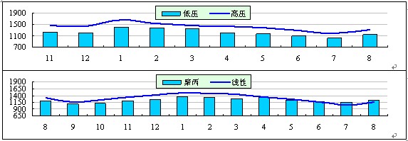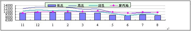 A、聚乙烯(PE):八月上旬國內大部分地區市場在外盤挺高和石化聯手大幅推價的牽引下升溫,價格沖高400-600元,其中線性、高壓聚乙烯漲勢偏強,市場成交未見量價齊升勢頭;進入中旬,隨著商家獲利了結和高價抵觸情緒的凸現,市場行情迅速降溫,價格下挫了200-400元,其中高壓跌幅偏大,整個聚乙烯成交陷入窘境。