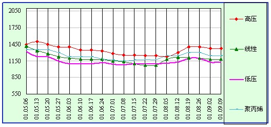 A、聚乙烯市場(PE):本周亞洲聚乙烯市場報價僵持暫穩,交易明顯放緩,大部分進口商已經滿足9月需求,不急于入市采購,貿易商多持謹慎觀望態度。本周亞洲地區聚乙烯報價如下: 高壓1380;低壓膜料1130低壓中空1130;線性1180美元/噸(CFR 中國主港/東南亞)。